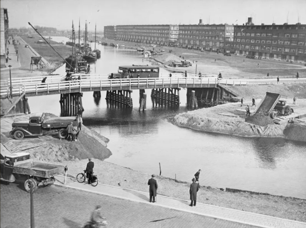 Stadhoudersplein in 1940 voor de demping van de Rotterdamsche Schie. Achter de brug ligt de Noorderhavenkade.
